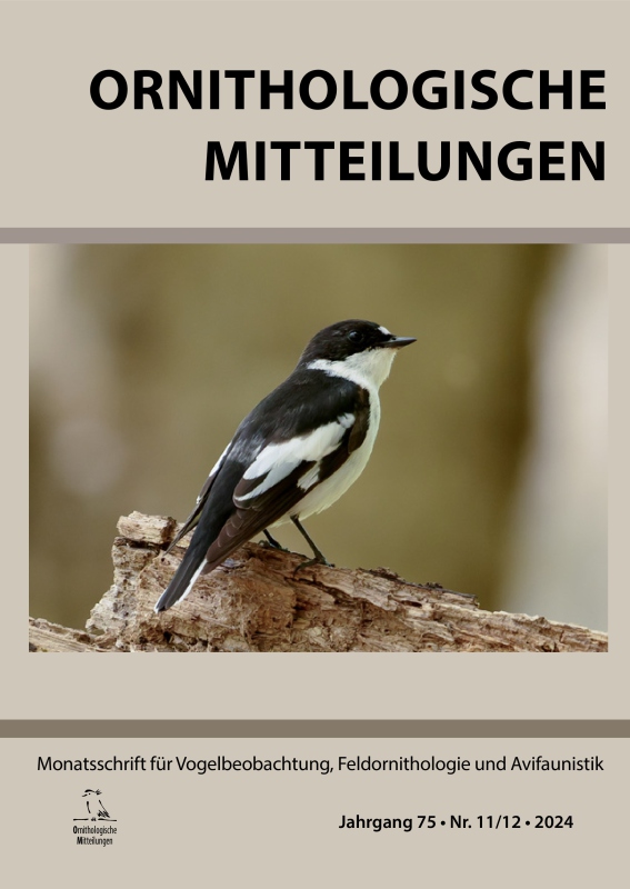 Boschert, M., Basso, A., Oertel, F. Peter, D., Weber, M.: Aktuelle Bestandsituation des Schwazmilans Milvus migrans in der mittelbadischen Oberrheinebene und angrenzenden Regionen Weihe, F., Günther, E.: Mittelspeche Dendrocoptes medius beim Ringeln - der Fotobeleg! Bergmann, H.-H.: Darf man Vogelfedern sammeln? - Konflikte zwischen Ornithologie, Naturbegegnung und Naturschutzgesetz Zöckler, C., Aung, P.: Kleptoparasitismus bei der Lachseeschwalbe Gelochelidon nilotica im Überwinterungsgebiet Ernst, S.: Vom Wert eines Kleinteiches mit Insel Schmid, W., Oektem, T.: Mäusebussard Buteo buteo erbeutet Turmfalke Falco tinnunculus Forum: Wie reagieren Uhus auf Lärm? Schmidt, A.: Biografien osteuropäischer Ornithologen (38): Egon Schmidt (1931-2023) - der Mann, der Generationen von Ungarn die Liebe zu den Vögeln vermittelte Nachruf auf Klaus Rettig (1936-2022) Nachruf auf Bernhard Johann Petersen (1931-2024)